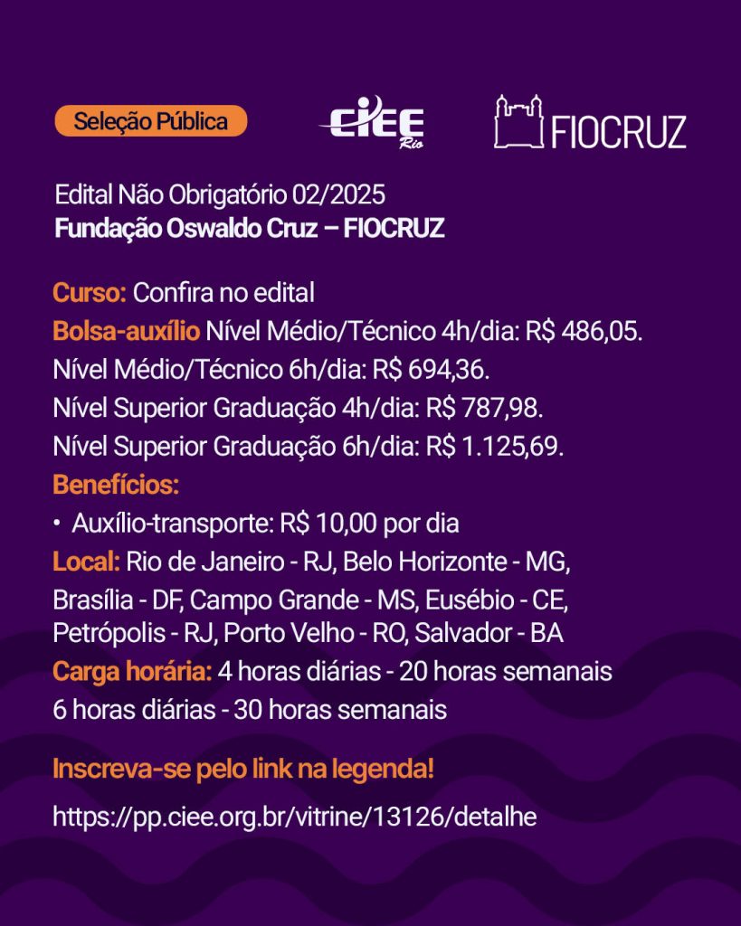 A Fundação Oswaldo Cruz e o CIEE Rio estão realizando um processo seletivo para o programa de estágio. As inscrições estão abertas, com vagas disponíveis em vários cursos. Não deixe seus alunos de fora dessa oportunidade de transformação!
