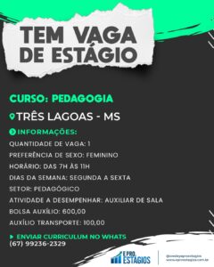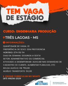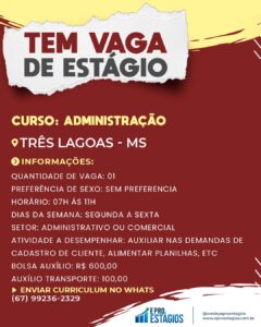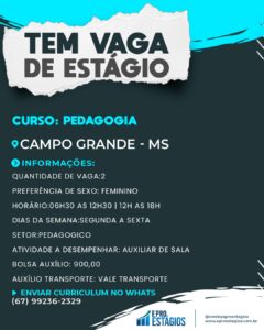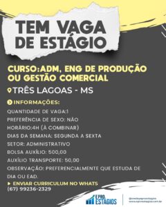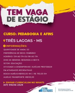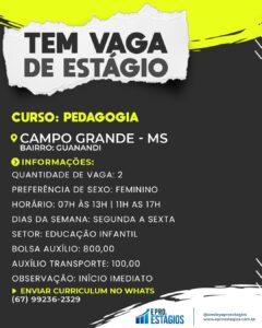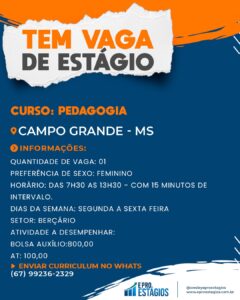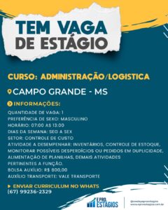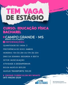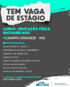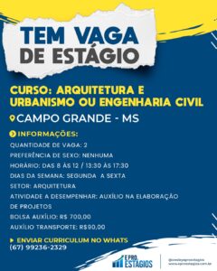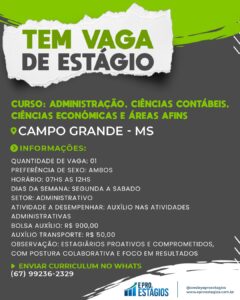 As vagas são para atuação em empresas parceiras localizadas em Campo Grande e Três Lagoas, com carga horária compatível com a rotina acadêmica e benefícios como bolsa auxílio, vale-transporte e possibilidade real de desenvolvimento profissional.