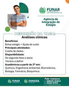 A FUNAR divulgou uma vaga de estágio para estudantes dos Cursos de Química, Engenharia Ambiental, Ciências Biológicas ou Farmácia. Maiores informações na imagem ao lado.