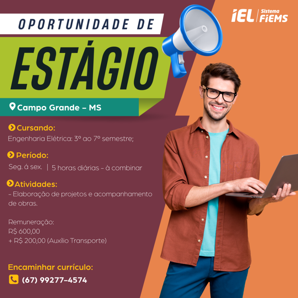 IEL divulga vaga de estágio para estudantes de Engenharia Elétrica. Maiores informações na imagem ao lado.