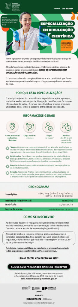 Inscrições abertas: Curso de Especialização em Divulgação Científica em Saúde