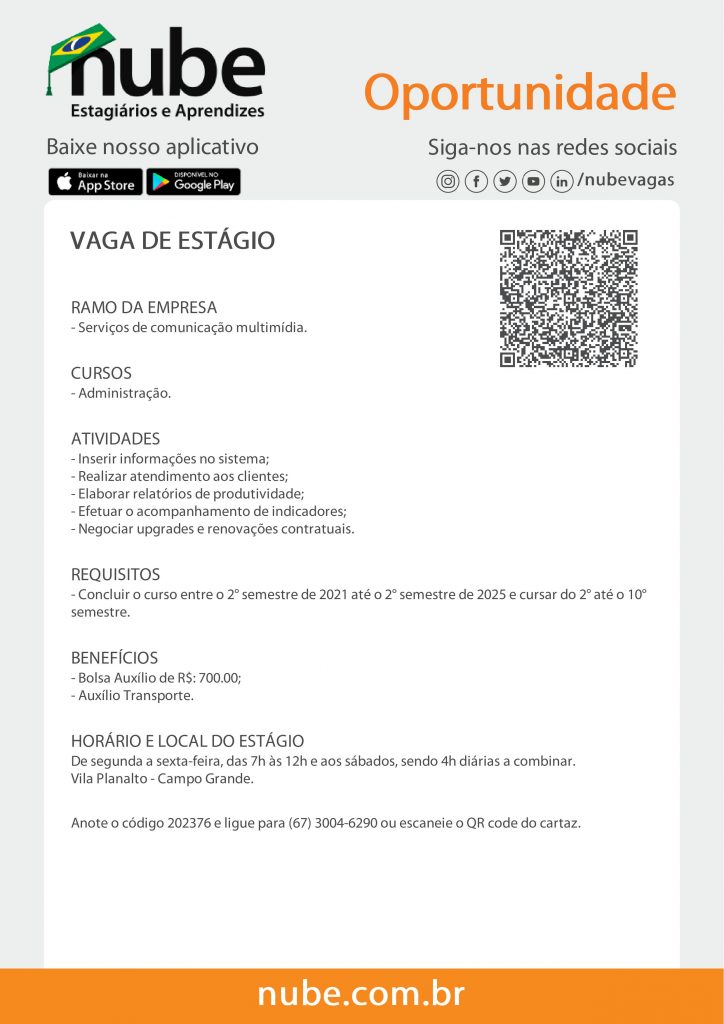 Nube anuncia oportunidade de Estágio para o curso de Administração