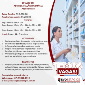 Evo Estágios está com vaga aberta para estágio Administração/Farmácia atendimento.