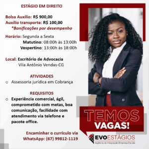 A Evo Estágios está com vaga aberta para estudantes de Direito – Escritório de advocacia.