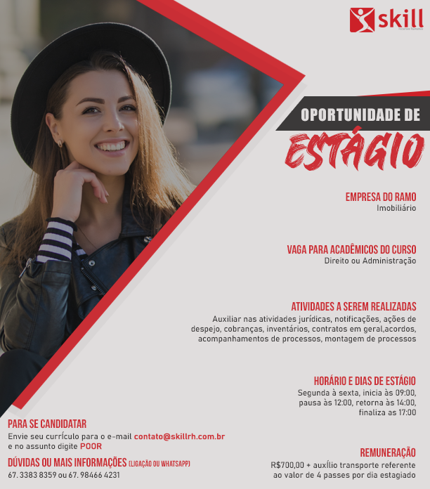 A Skill divulgou nesta sexta-feira, dia 02/07, vaga de estágio para acadêmicos de Administração ou Direito.