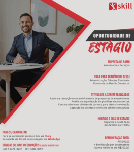 A Skill RH está com vaga de estágio para acadêmicos de Administração, Ciências Contábeis, Ciências Econômicas ou Gestão Comercial.