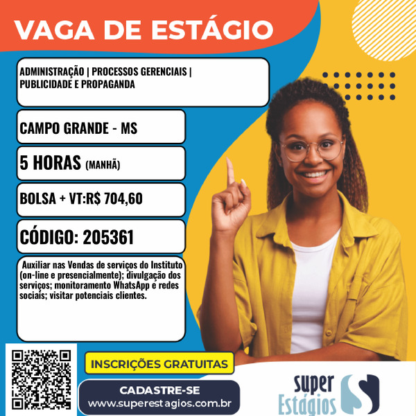 Atividades a serem desenvolvidas: Auxiliar nas Vendas de serviços do Instituto (on-line e presencialmente); divulgação dos serviços; monitoramento WhatsApp e redes sociais; visitar potenciais clientes.