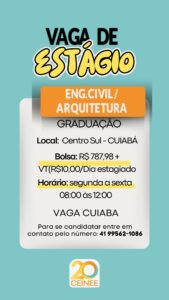 A CEINEE está com vaga de estágio para Engenharia Civil/ Arquitetura. Atuação na em Cuiabá/MT