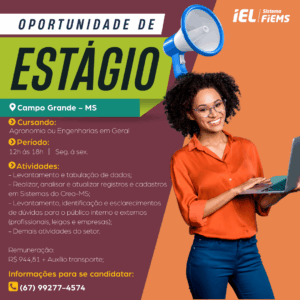 IEL está com vaga de estágio para estudantes de AGRONOMIA e ENGENHARIAS EM GERAL e que residem em Campo Grande.